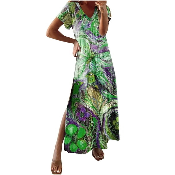 Spring Maxi Dresses For Women 2022 Thin Casual Vintage Color Block Animal Print Side Slit Short Sleeve V Neck Long Dress Walmart Com